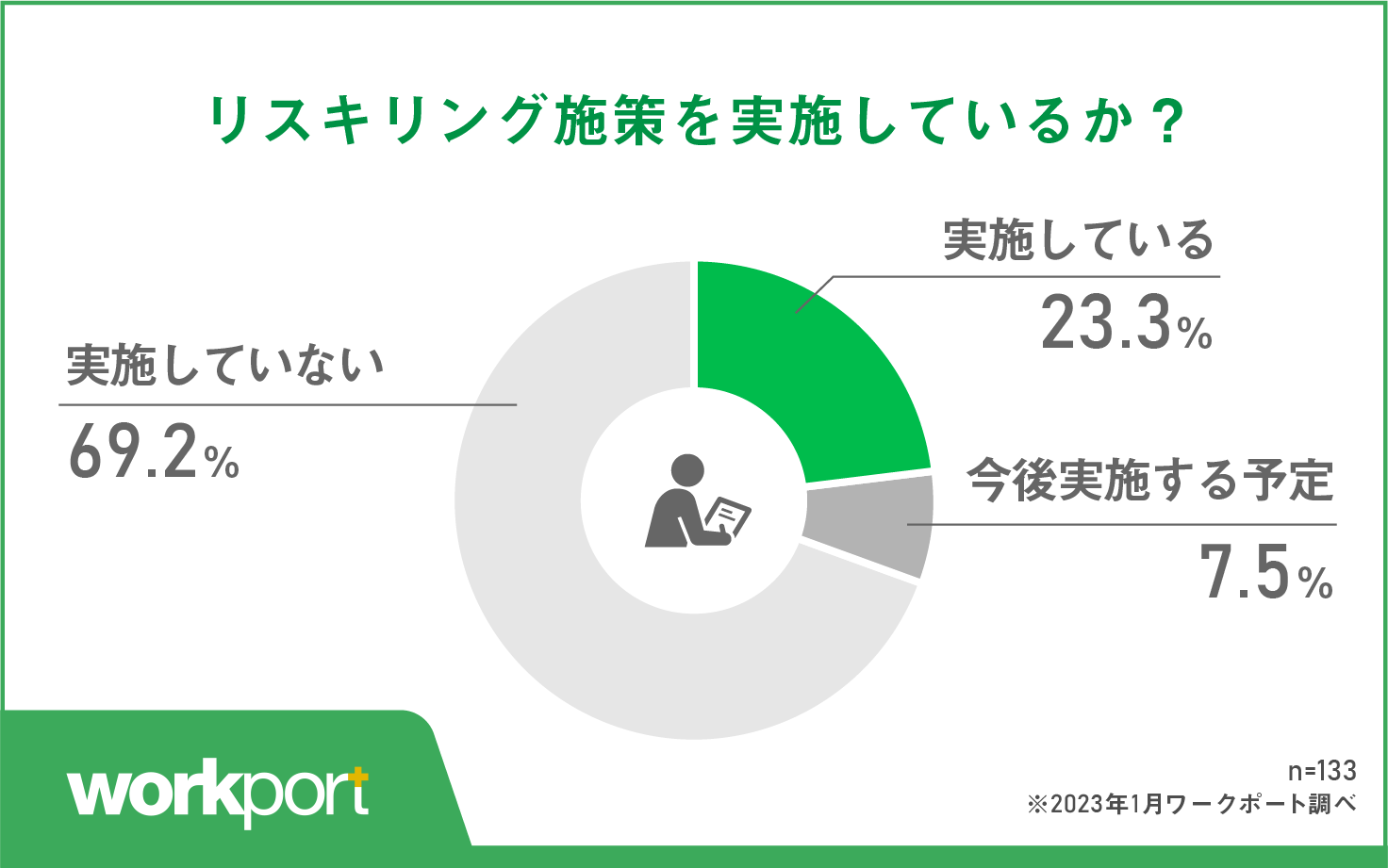 従業員のリスキリング施策を現在実施しているか聞いたところ、「実施している」と回答した企業は23.3%に留まりました。「今後実施する予定」と回答した企業も7.5%のみで、実施予定もない企業が69.2%を占めました。リスキリングを喫緊の問題と捉えているにも関わらず、実施に踏み出せていない企業の多さが目立ちました。